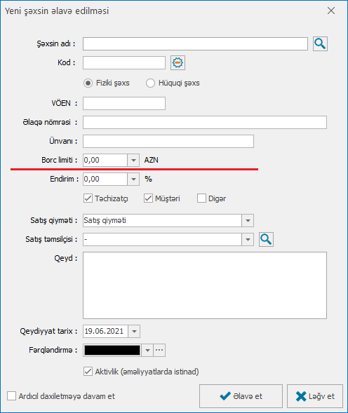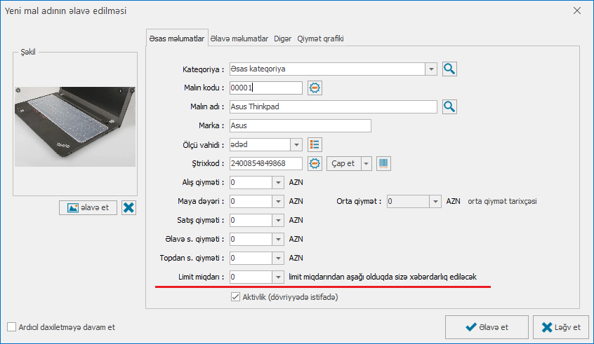 Malların anbarda qalıq limitinə, firmaların və müştərilərin borc limitlərinə nəzarət funksionallığı mövcuddur. Mal adı, firma və müştəri daxil edilərkən limitlər təyin edilir. Bu limitlər əsasında əməliyyatlar zamanı istifadəçiyə xəbərdarlıqlar edilir.
