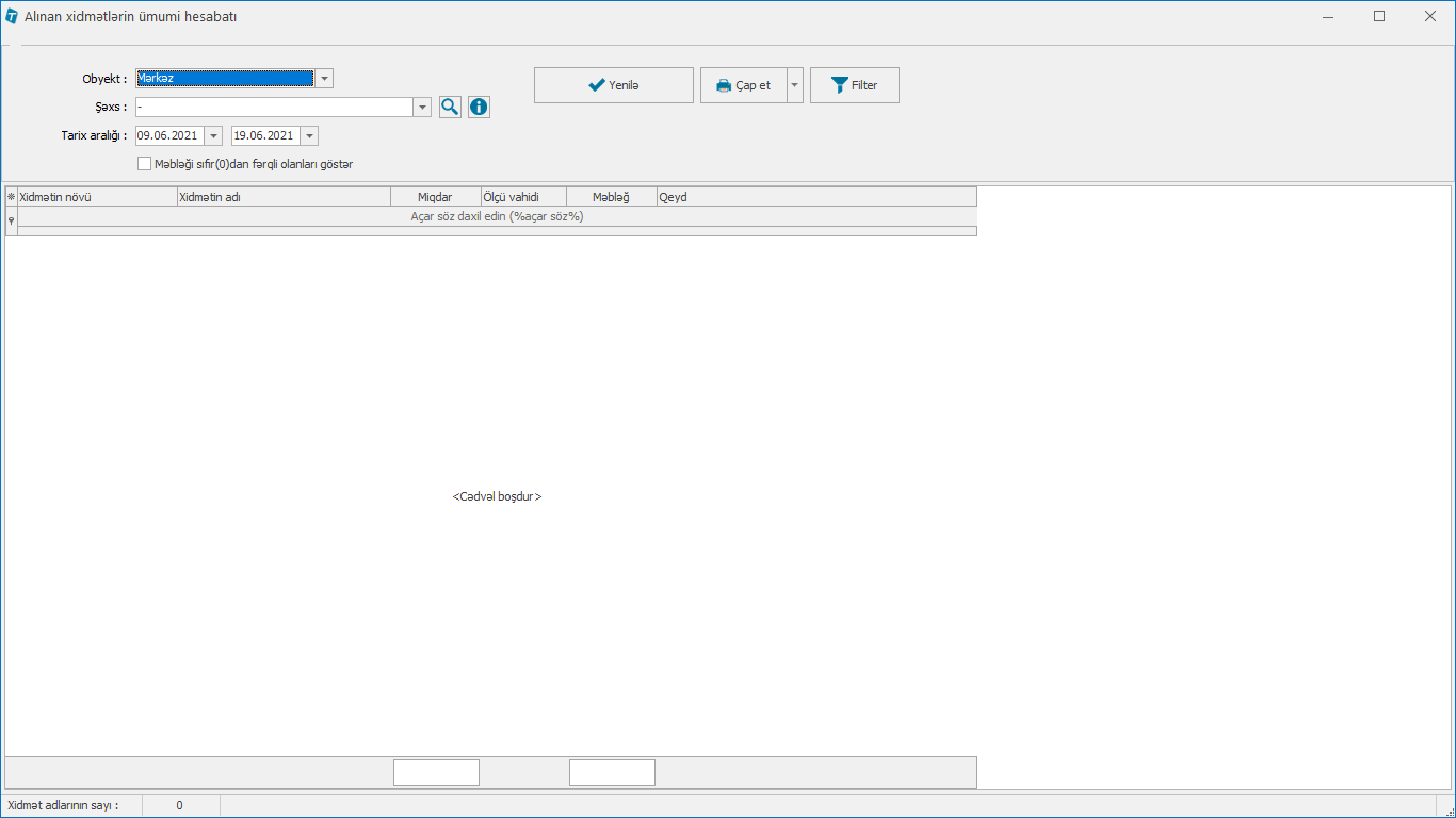 Hesabatlar > Xidmətlərin hesabatı > Alınan xidmətlərin ümumi hesabatı
