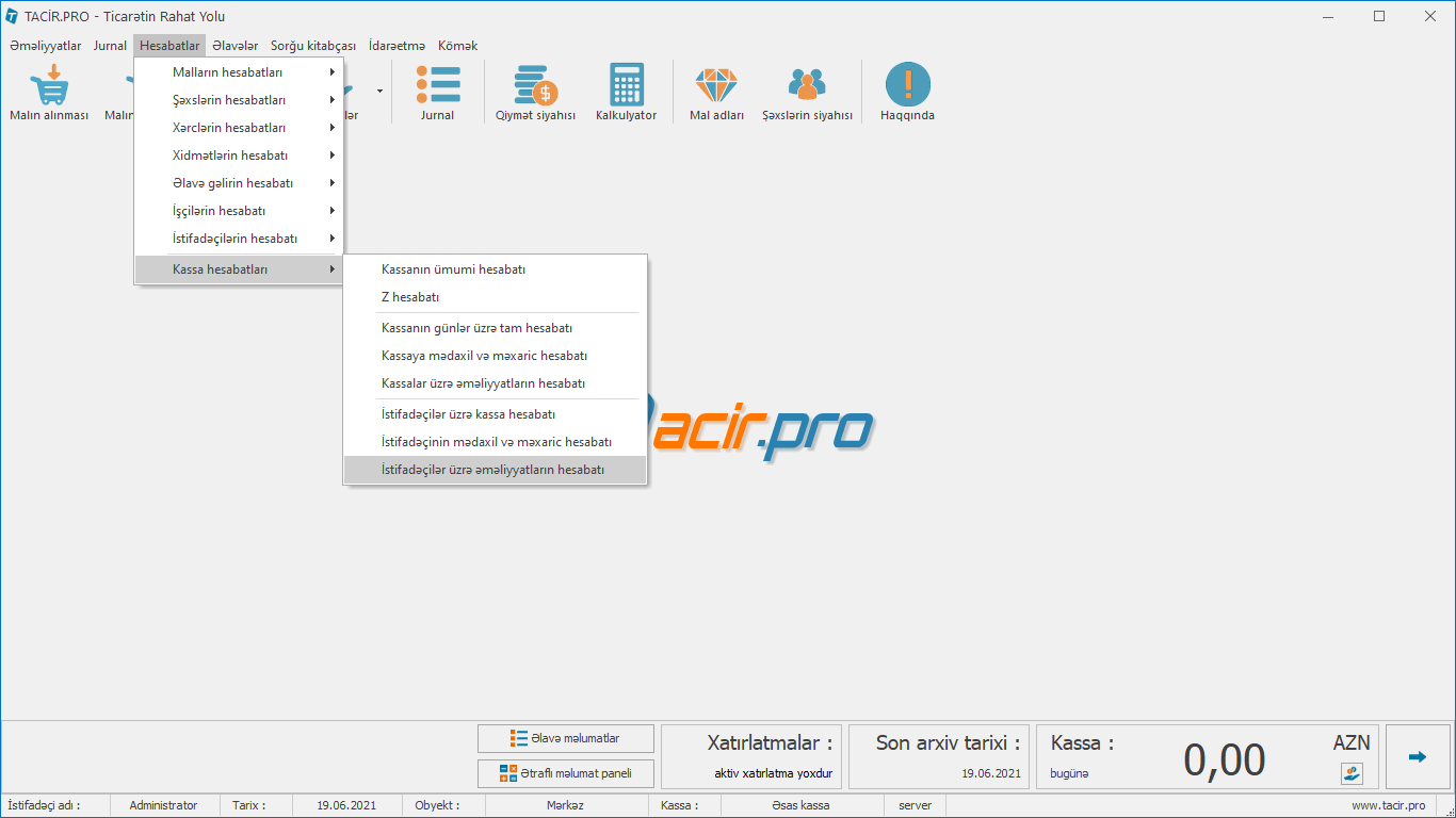 Hesabatlar > Kassa əməliyyatı > İstifadəçilər üzrə kassa əməliyyatı